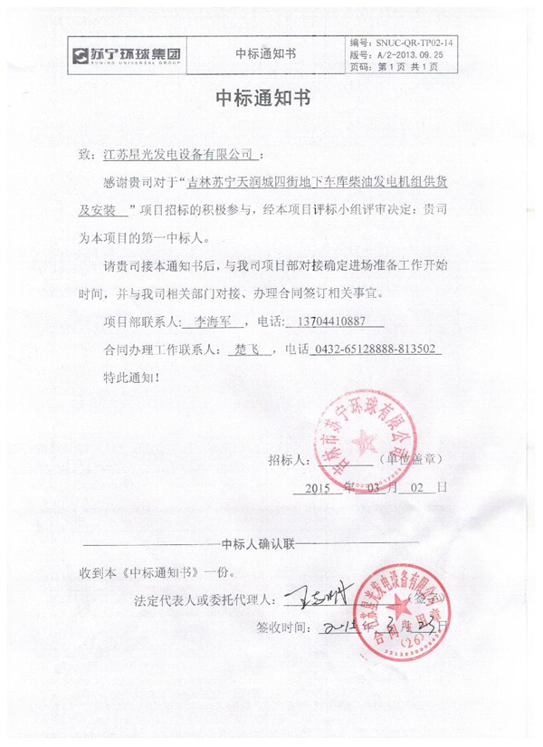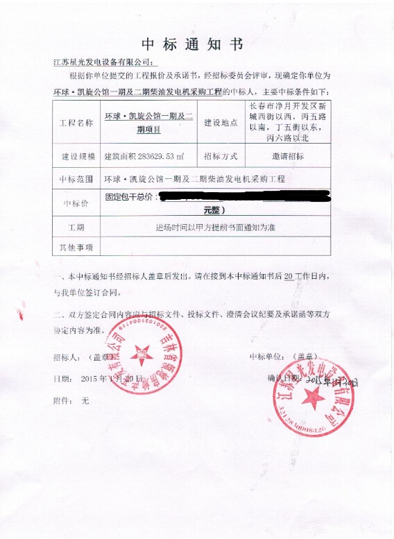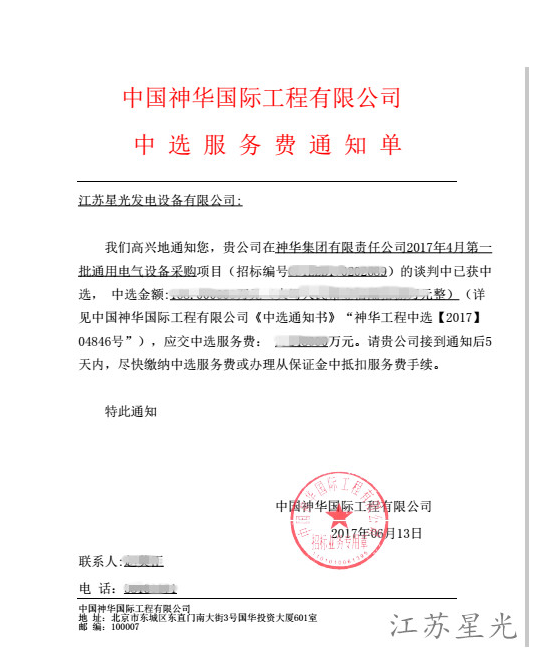 中國神華國際工程有限公司發(fā)電機(jī)組采購中標(biāo)通知書