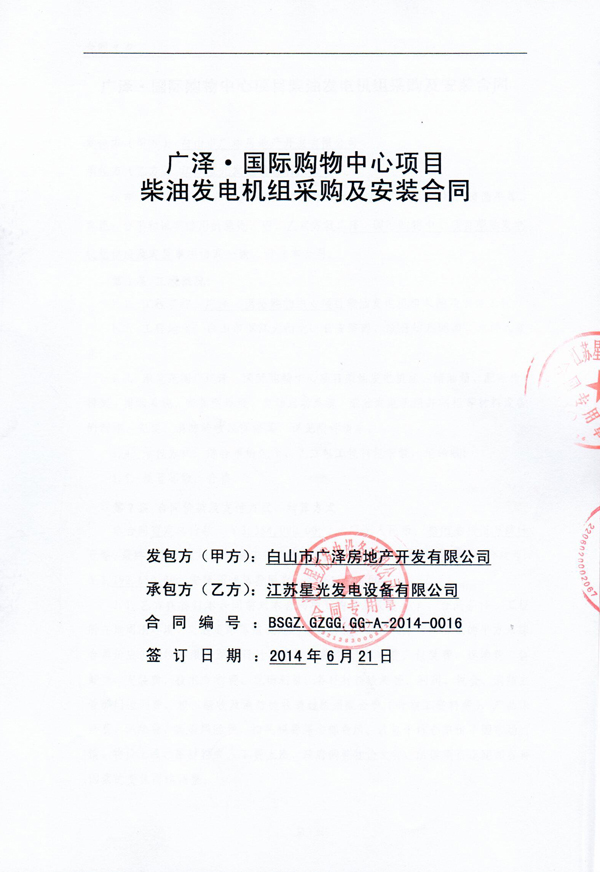廣澤國際購物中心項目柴油發(fā)動機(jī)組采購及安裝合同