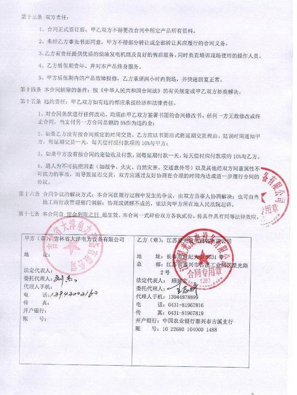 中國農(nóng)業(yè)發(fā)展銀行吉林省分行柴油發(fā)電機(jī)組安裝合同