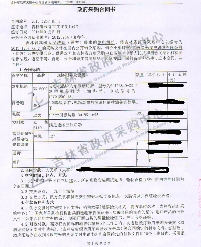 吉林省高級人民法院政府采購200KW發(fā)電機(jī)組: XG-200GF發(fā)電機(jī)組、星光靜音箱、遠(yuǎn)大電纜、眾智6110控制器、風(fēng)帆高能鉛酸密封蓄電池
